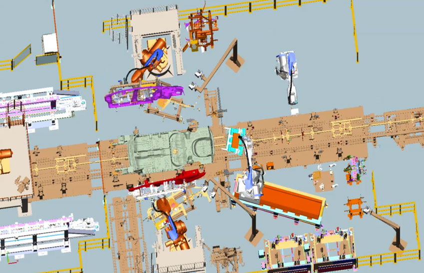 案例背景:在汽车车身拼接中,点焊工艺应用广泛,且基本由机器人完成。需要通过仿真来验证点焊工艺规划,确保机器人操作的准确性和安全性。